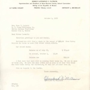 Cleveland Williams, letter, 1956 Oct. 4, to Rose Lockett regarding printing balance. [Description English/roman)]