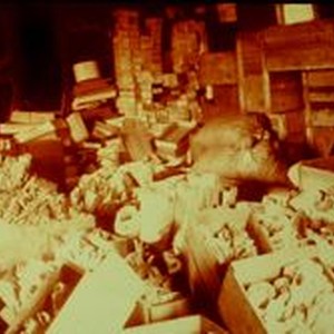 Slide--black and white: Boxes of Burbank plant bulbs, some wrapped in paper in wooden boxes, some in burlap bags.