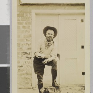 Author Clem Yore stands with one foot perched on stump in front of wooden doorway. He wears jodhpurs and a hat. Title and date transcribed from envelope. Verso of photo reads: "To Charmian London. Here you are! It's Clem Yore of today."