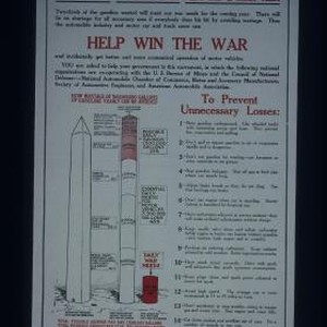 Don't waste gasoline! Two-thirds of the gasoline wasted will meet our war needs for the coming year. There will be no shortage for all necessary uses if everybody does his bit by avoiding wastage. Thus the automobile industry and motor car and truck users can help win the war. ... To prevent unnecessary losses : ... [listing of 15 conservation measures]