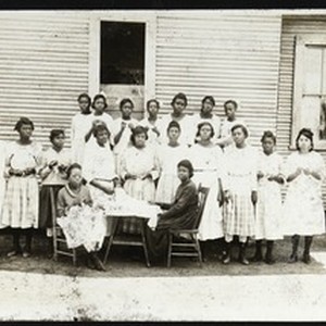 Photograph of 18 unidentified girls and women, [s.d.]. "Emma Bradley" -- stamped on back. [Description English/roman)]