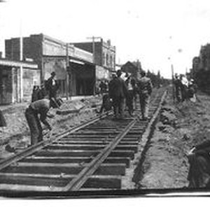 Photo--black and white: Railroad workers laying rails of P&SR electric railway down Main Street Sebastopol circa 1904.