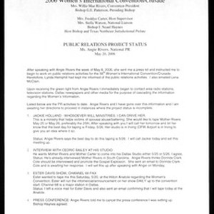 Women's International convention, Texas Northeast, Church of God in Christ, Public relations project status report, 2006 May 20. Submitted by Glenda Williams Goodson. [Description English/roman)]
