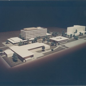 This photograph of a model of Broida Hall shows a view from the south, with Webb Hall and the Woodhouse Laboratory in the foreground. In addition to classroom and office space, Broida also has two lecture halls. As one of the later works of Charles Luckman Associates at UCSB, the architectural vocabulary highlights the horizontal lines, re-enforced concrete, and overhanging sunshades on the windows as part of the "late campus standard" architectural style.