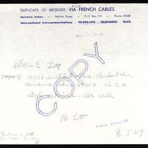 Willie E. Lott, 10101 Westchester Avenue, Cleveland, Ohio, USA, telegram, 1978 March 9, to Beatrice S. Lott, Monrovia, Liberia. [Description English/roman)]