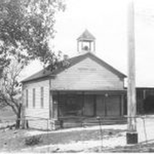 Photo--black and white postcard: Spring Hill School as seen in 1914. School bell in bell tower visible and valley beyond in back of the school.