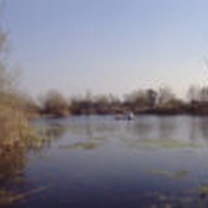 View of Bernard Field Station lake with two students in a boat.