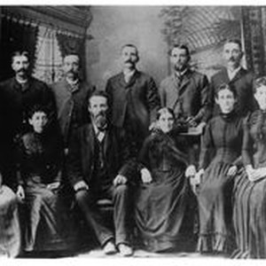 Photo--black and white: Family photo of the Isaiah Thomas and Eliza Jane Martin Thomasfamily, one of the pioneer families of Green Valley California. Pictured L to R, back row: Henry Rambo (b May 7, 1873), Zachariah, Samuel, Isaac (b Mar 21, 1850), John Elton, Alfred Ross and Jacob. Front row: Rachel Armenta (b1876), Mary Ellen(b Dec 17, 1856), Isaiah (father), Eliza Jane (mother) (1828-1924), Sarah Ann (May 24, 1855) and Matilda Sophronia (June 30, 1870). Isaiah Thomas was born in Champaign County, Ohio in 1826. Eliza JaneThomas was born in Hancock County, Indiana in 1829. They came to California in 1854. In 1858 he purchased 405 acres in Green Valley. Isaiah was a successful rancher who tok considerable interest in public and private life. He was a member of the first Green Valley School Board of Trustees. Family lore tells of daughter Sarah, "the best horse woman in California" as a young girl rode her horse to Petaluma once a week for the family mail. Isaish was fond of saying that they arrived in California in 1854 with two children, two oxen, two cows and $2.75.
