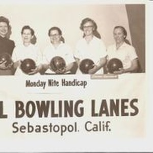 Photo--black and white: Caption: "Monday Nite Handicap L & L Bowling Lanes Sebastopol, Calif." Five women holding bowling balls. From left: unknown, Agnes Keeley, Maxine Irwin, sister of Agnes, Mary (Friday) Pelmulder. L & L Bowling Lanes was located at 962 Gravenstein Highway South, Sebastopol. California. The Lanes were torn down in the 1990s and replaced with the R.S. Basso furniture building. Agnes Keeley and her sister, both nurses, co-leased and operated the original Palm Drive Hospital in the 1940s which was a private residence owned by Al Helwig.