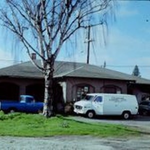 Slide, color transparency: The back of the historic Petaluma & Santa Rosa Railway depot looking west, in use as Clarmark Flower Shop at 261 South Main in Sebastopol.
