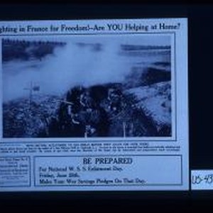 Fighting in France for freedom. Are you helping at home? Issued by Connecticut State Council of Defense, State Capitol, Hartford, Connecticut. Be prepared. For National W.S.S. Enlistment Day, Friday, June 28th. Make your war savings pledges on that day