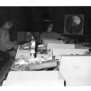 Photo, black and white: SAGU (Sebastopol Apple Growers Union) packing plant with workers bagging apples, late 1970s.