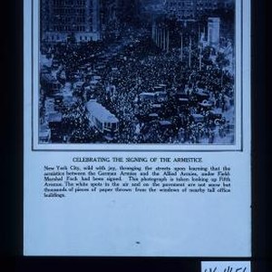 Celebrating the signing of the Armistice. New York City, wild with joy, thronging the streets upon learning that the armistice between the German Armies and the Allied Armies, under Field-Marshal Foch had been signed. This photograph is taken looking up Fifth Avenue. The white spots in the air and on the pavement are not snow but thousands of pieces of paper thrown from the windows of nearby tall office buildings