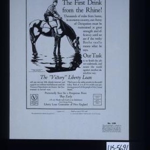 Compare his sacrifices with yours ... Buy early and wear a button. Patriotically save for a prosperous peace ... Liberty Loan Committee of New England. [Verso:] The first drink from the Rhine. Thousands of miles from home, in an enemy country, our Army of Occupation must be maintained at great strength and efficiency until we see if the tricky Boche really means what he says