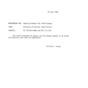 Director of central intelligence memo to deputy director for intelligence regarding draft estimates on Cyprus and the Aegean, with attachment