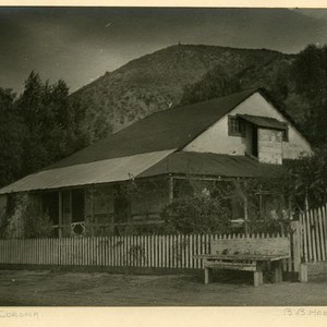 Adobe, Near Corona, California: 2-story house w/picket fence.