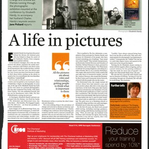 Article on Elizabeth Handy's photography and how it correlates with husband Charles Handy's work. The article begins discussing Elizabeth Handy's temperament before proceeding to talk about her career in photography, as well as her working relationship with her husband. It then notes how the most striking feature of Elizabeth's and Charles's work is the prevalence of change and renewal, and how aging has altered Elizabeth's perspective on life.