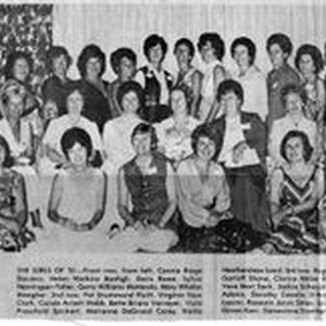 Photo--black and white: The women of the Analy High School Class of 1951 reunion in July 1976. Front row L-R: Connie Biega Daviero, Helen Watkins Bonfigli, Doris Rowe, Sylvia Henningsen Fisher, Gerry Williams Mattorolo, Mary Whelan Meagher. Middle row: Pat Drummond Fluitt, Virginia New Clark, Carole Arnett Webb, Bette Brians Varreyer, Viola Proschold Spickert, Marianne DeGrood Carey, Nelda Heathershaw Laird. Back row: Regena Green Ayers, Jackie Garloff Shone, Clarice Miller Webb, Nancy Pdera Keith, Vera Mori Sack, Jackie Scheuer Knecht, Gaea Freimund Adams, Dororthy Canelis D'Ambrogia, Sharon Kellogg Lazzini, Roseann Jarvis Stiles, Lois Mann Schaeffer, Gladys Ginesi Kerr, Genevieve Gambetta Beagle.