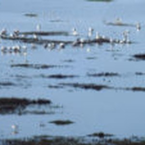 Avocets and other birds at mouth of [illegible] creek at high tide in Morro Bay.