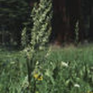 A green stalk with branches of small lighter green flowers at Round Meadow in Sequoia National Park's Giant Forest.
