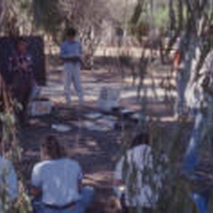 Susan Meyer giving lecture to circle of people.