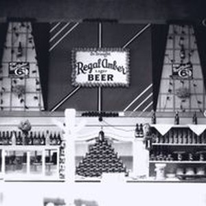 Photo--black and white: Gravenstein Apple Show display of Regal Amber Lager Beer, about 1930's. Bottles of beer displayed with cans of crab and apples.