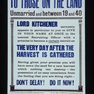 To those on the land, unmarried and between 19 and 40, Lord Kitchener earnestly appeals in particular to you to give in your name at once to the nearest recruiting officer with a promise to become a certain recruit on the very day after the harvest is gathered