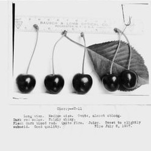 Photo--black and white: Identification of Luther Burbank cherry hybrid from the Gold Ridge Experiment Farm. Cherries and leaves. Information attached: "Cherry--U-11 Ripe July 8, 1927."