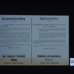 Bekanntmachng. In meiner Verordnung ... habe ich folgendes angeordnet ... Ich bestimme ... dass vonjetzt ab alles Mehl ... ohne weiteres der Beschlahgnahme verfallt ... Kalisch, den 27. Juli 1915. ... Ogloszenie. ... Niemiecki Szef powiatowy Hahn, Tajny radca rejencyjny