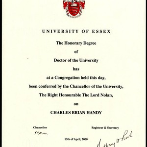 Charles B. Handy's University of Essex honorary degree certification. The document indicates that the degree has been conferred by the Chancellor of the University, the Right Honourable Lord Nolan. It has been signed by Nolan, the Registrar, and Secretary, and also contains the university's coat of arms.