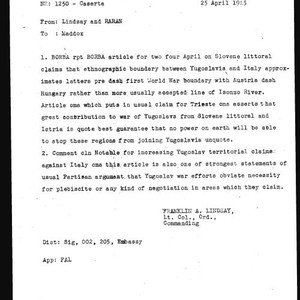 Franklin A. Lindsay and Raran message to Maddox number 1250 regarding Yugoslav-Italy boundary