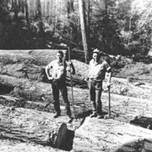 Photo--black and white: Photo, Black and white: Ralph S. Sturgeon, left-owner and operator and Wilbur Henningsen, holding the axe at Sturgeon Sawmill. This snap shot taken with box camera Wednesday, September 5, 1945. Wilbur was James Ejnar Henningsen's brother who was Sturgeon's partner. Caption taken from handwritten information on verso of photo by Ralph Sturgeon. "Wilbur was a good woodsman--that I found out in but a few days and he had done little of it. He came off a rigging job in Mare Island as a Boss about the time World War 2 was over. We first logged in Joy Woods in area & canyons sort of northwest of school the season before. Will & I used Dolbeer-Carson donkey--powered with a Steven--Dureau gasoline engine that Ed LaFont hooked up for us in the place of steam. This donkey came from Gualala back in late 1920's (or mid 1920's that is, 1926 I believe). Anyway after a few weeks A. J. Blaney, through the help of E. Fritz--University of California Prof (about end of W. War #2) was able to buy through Priority granted, his first crawler tractor--a war green T-D-14. Fron here on we got down to logging. A. J. & I fell most of the timber that year on Joy's. Denisio (sp?) Donati & John Donati fell a few to start where Will & I logged with donkey. Ejnar (Jim) Henningsen spent a few days bucking, but late run Sturgeon's Mill yard when we logged. Now this photo or snap-shot taken on our next move over on Ed Smith's Coleman Valley. We cut a strip of fir & redwood right up along Coleman's north line, or Smith's south line. Cut redwood fir some months before in winter did Steve Panoli & I (Indian from Stewarts Point.) His nephew peeled. After falling redwood for a day or two I'd leave until Steve got it bucked. I filed. In this picture is the fir I fell. I was head chopper & filed. Those that helped were Kenneth Sullivan (17 yrs old) Dad a doy or so, maybe more & Wilbur Henningsen. Andrew Jackson Blaney logged tractors & 1 loader (loader used from Point Reyes. 1--T-D-14 mid 1940-s or 1944, No canopy or winch 1--T-D-18 1950, fully equipped for logging 1--(7) 17-A Cat 1--(7) 48-7-E (1965 or about) Cat 1--(6) Cat One 175 Michigan loader After Ed Smith's, Steve Panoli & nephew, Elmer Panoli fell, bucked and peeled redwood timber (Steve Meeker tract) south of Occidental probably ½ to ¾ mil south, but not down road to Freestone but off Bittner Road, turning left out of town S.W. at end of Long bridge. "