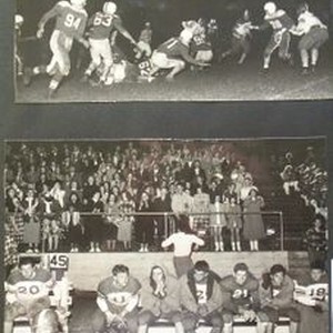 Photo--Black and white: Analy High School football game vs San Rafael at San Rafael, Friday night, October 14, 1949. Bottom photo shows Analy Tigers on the bench, with fans in bleachers in background. Analy 27--San Rafael 6