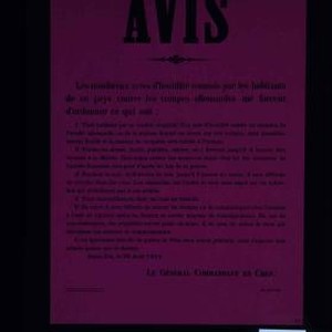Avis. Les nombreux actes d'hostilite commis par les habitants de ce pays contre les troupes allemandes me forcent d'ordonner ce qui suit: ... Saint-Die, le 28 aout 1914. Le general commandant en chef