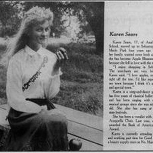 Photo--black and white, mounted: newspaper photo of Karen Sears, Apple Blossom Queen circa 1980s. An article is to the right of Karen's picture and gives a short story about her.