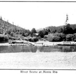 Print--black and white: Postcard booklet photos of Monte Rio on the Russian River, California circa 1900s. Caption: River Scene at Monte Rio