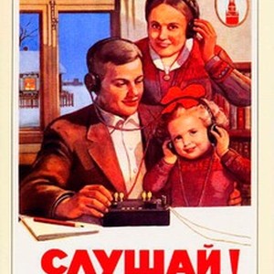 A poster showing a man, a woman and a little girl with headphones on, all listening to an old fashion radio. The caption reads, "Slushai, govorit Moskva!" meaning "Listen, Moscow is speaking!". [Description English/roman)]