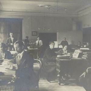 A photograph showing an office of VSEKh (Vsesoiuznyi Sovet Evangel'skikh Khristian / All-Union Council of Evangelical Christians) in 1925. [Description English/roman)]