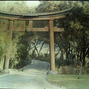 Autochrome view of the Torii Gate over the road leading to the Japanese garden. The Torii gate was taken down due to disrepair during World War II and was never replaced. MS note on verso of plate mounting reads "Japanese Garden - Toro Gate."
