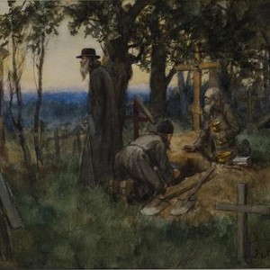 Ivan Vladimirov watercolor scene of Russian clergymen hiding church treasures in a new grave