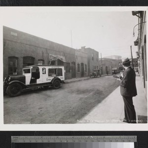 View of Napier Street in Old Chinatown, Los Angeles, with automobiles and pedestrians. An Arden Milk truck is parked at the left of photograph. The Los Angeles Hall of Justice is visible in the background. Title transcribed from photograph.