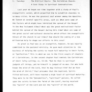 Triad convention & holy convocation, Women's Department, Church of God in Christ, John Wesley Wilson Institute, South Carolina, 1989?, day 1 syllabus, "The biblical basis: the Corinthian church: a case study in spiritual contradictions". [Description English/roman)]
