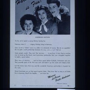Harmony is fun! Andrews Sisters. ... Good Americans are on their guard against hate. They know that as long as all faiths live in harmony, they'll live happily ... and have fun
