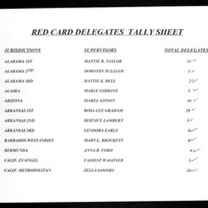 Three sets of red card deligate tallies for the 49th Annual Women’s International Convention, Church of God in Christ, Detroit, Michigan, 1999 May 24-28 [Description English/roman)]