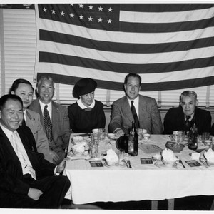 Senator Thomas Kuchel (seated, third from right), Mabel Hong (Kuchel's right), Y. C. Hong (Kuchel's left), Henry Lowe (first from left), and Wilbur Woo (second from the left, in the foreground). Hong family papers. The Huntington Library, San Marino, CA.
