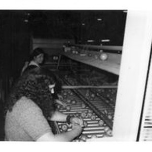 Photo, black and white: Workers at an apple sorting table working with Jonathon apples circa late 1970s.