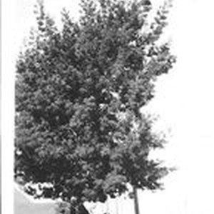 Photo--black and white: A large acasic tree at Mill Station Road in Sebastopol, location of the Rosebrook Farm owned by William and Leona Rosebrook.