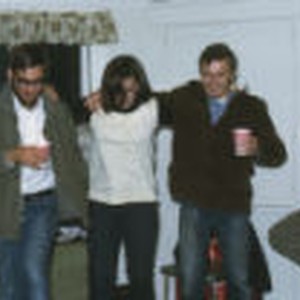 Dave Powelson, Chip Hogue, Terri Hoban, and Lee Doering celebrating at a senior party for Pomona College students.