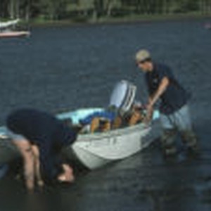 Student pushing boat to shore while another student digs in mud. Sailboats in background.