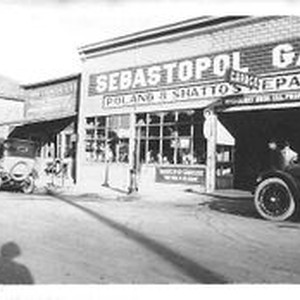 Photo--black and white: Sebastopol Garage building circa 1920s. The McCaughey Bros Inc. owned the Garage with A. S. Huck manager. Signs advertise Poland and Shatto repairs, Associated Gasoline. To the left is the Wing Yuen Tai Co. General Merchandise and Japanese & Chinese Employment Office. Chrystal White Soap sign. Both businesses were located to the immediate left of Pellini Chevrolet building. The Chinese store was torn down and the garage and store lot were eventually incorporated into the present Pellini location. The alley to the immediate left of the Wany Yuen Tai store (current street to the right of Pellini used car lot) was known as South China Street during these early years. A Chinatown thrived there from just past the 1900s and into the 1940s. The building immediately to the left of the Wang Yuen Tai store was Bridgeford Planing Mill. The McCaughey Brother, Inc. owned Sebastopol Garage, and Sam Huck, Sr. was the Manager.